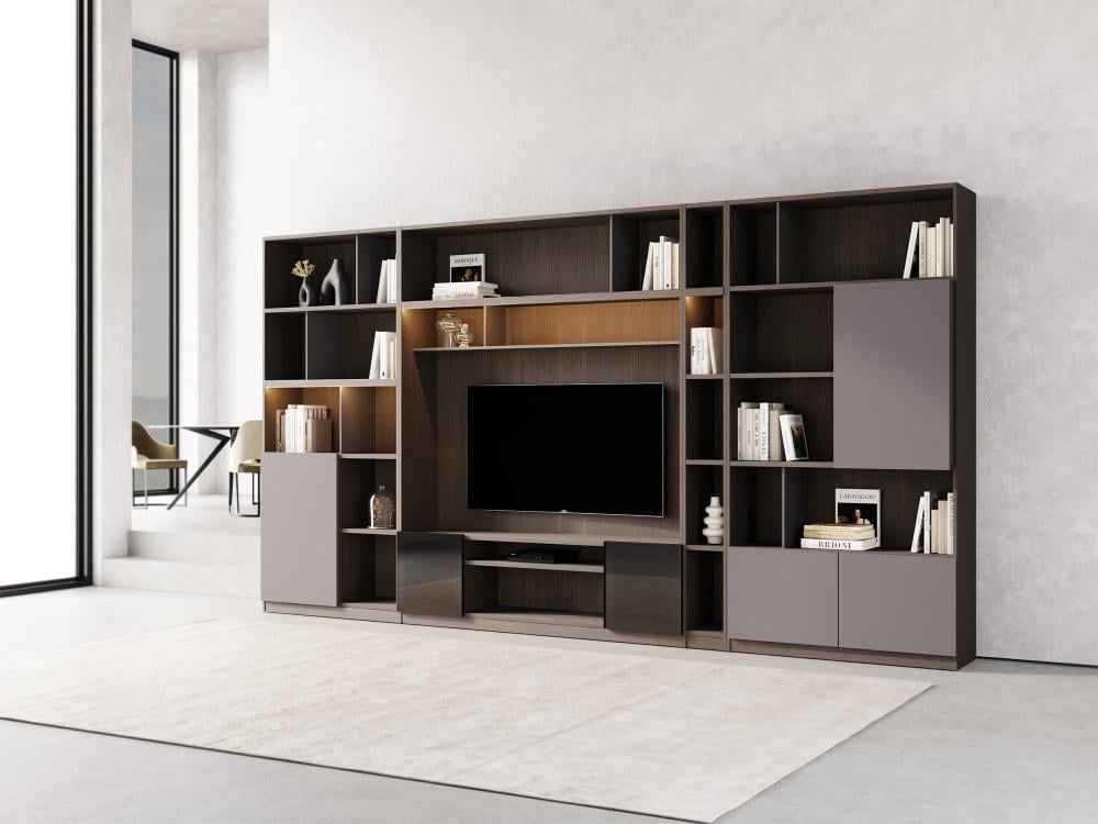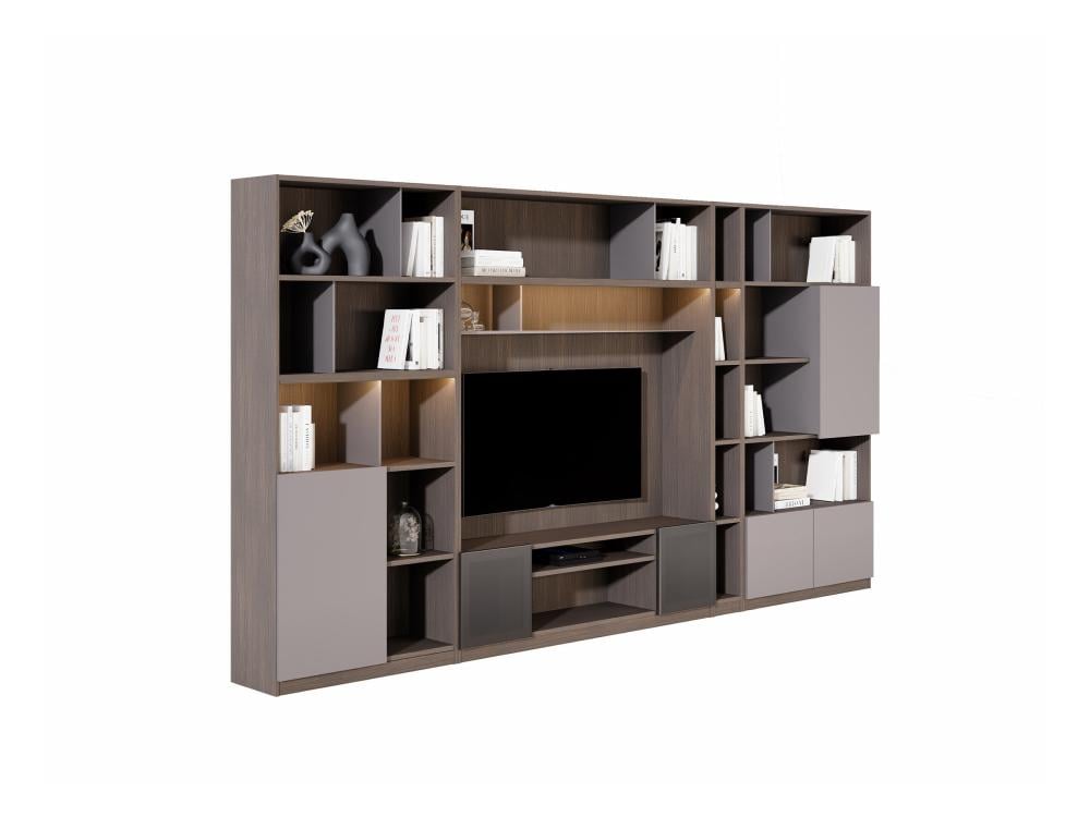 تعتبر وحدة التلفاز المثبتة على الحائط مع رفوف خيارًا مثاليًا لمن يبحثون عن تنظيم عصري للمساحات الصغيرة أو المتوسطة، وتعمل على خلق بيئة مريحة وأنيقة في المنزل.
